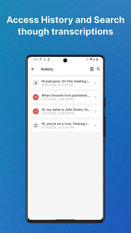 Ne perdez jamais la trace de vos transcriptions et résumés. L'application enregistre toutes vos données dans un historique organisé, ce qui facilite la révision des transcriptions précédentes. Notre fonction de recherche robuste vous permet de trouver un contenu spécifique en quelques secondes, vous garantissant ainsi d'avoir toujours accès aux informations dont vous avez besoin, quand vous en avez besoin.