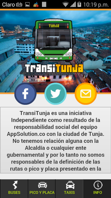 TransiTunja utiliza el GPS de tu celular para geolocalizarte y mostrarte las nuevas rutas de transporte público en Tunja. También utilizando Google Maps podrás ver la zona de pico y placa que aplica en la ciudad, junto con el directorio telefónico de las empresas prestadoras de servicio de Taxi.