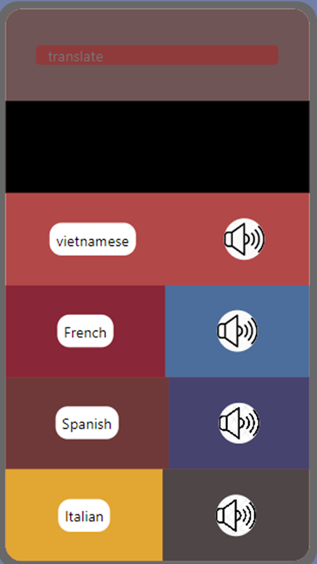 il y a une zone de texte où vous mettez la phrase que vous souhaitez traduire et là, il y a plusieurs boutons qui affichent différentes langues, cliquez simplement sur le bouton et la phrase sera traduite avec lui, chaque bouton comprendra un bouton de haut-parleur qui parlera énoncer la phrase dans la langue choisie.
