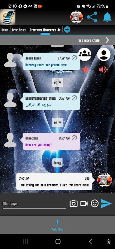 **Trek Browser** by ComStar Productions is your ultimate Star Trek-themed internet browser for Android. Immerse yourself in a galaxy of adventure with features like TrekTV for your favorite Star Trek episodes, Starfleet Holodecks Jr for interactive and entertaining experiences, and a vibrant chat room for connecting with fellow Trekkies. Embark on a browsing journey that's out of this world—engage with Trek Browser and boldly go where no browser has gone before!