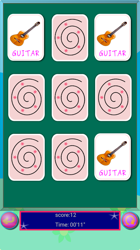 Initially you will see all cards turned face down. Tap on one of the card and remember the picture on it. With the next tap try to find and flip the cards with the same picture as previous ones. If the pictures on the both memory cards will be the same, they will stay opened and you can continue with the next pair. Otherwise both cards will flip back over and you will get another try. Try to find all matched cards as fast as possible.