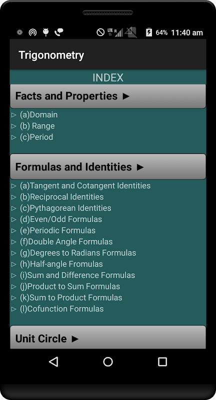c) Les formules et identités (y compris les identités Tangent et Cotangente, identités réciproques, Identités de Pythagore, Formules paires / impaires, des formules périodiques, des formules doubles chevrons, le degré de formules radian, des formules demi-angle, la somme et les formules de différence, le produit à des formules forfaitaires, résumer à des formules de produits, et Co formules de fonction)