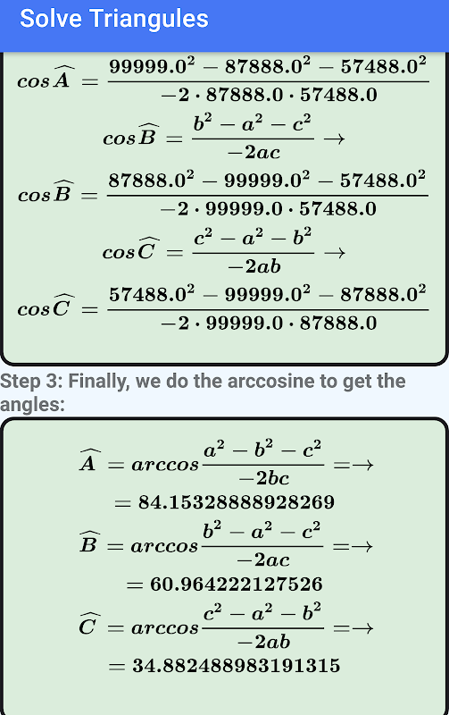 Par conséquent, l'utilisateur doit d'abord introduire trois valeurs (l'une d'entre elles doit être un côté). L'application utilisera le théorème du cosinus et le théorème du sinus (et la somme des 3 angles du triangle est de 180 degrés) pour calculer les trois autres valeurs.