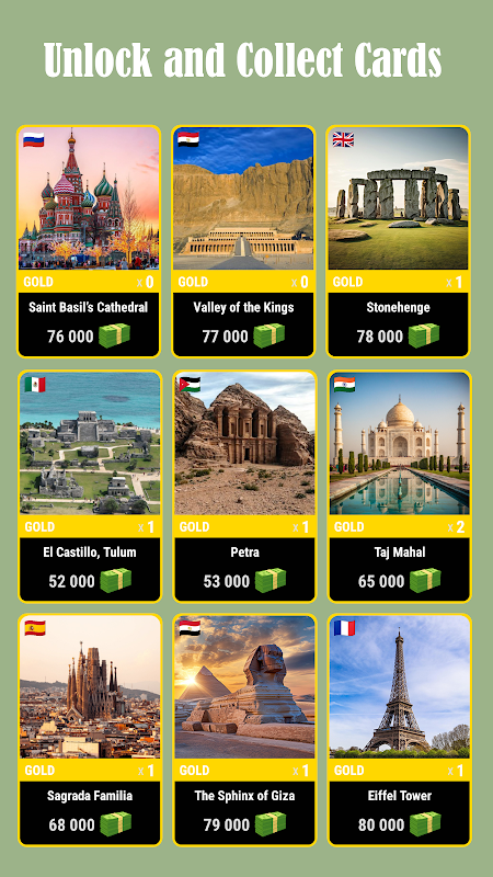 Explorez et apprenez en jouant ! Débloquez des cartes emblématiques et découvrez des anecdotes amusantes sur des sites célèbres tels que la Tour Eiffel, la Statue de la Liberté, Big Ben, le Colisée et la Grande Muraille de Chine. Un mélange parfait de divertissement et d'apprentissage pour les esprits curieux.