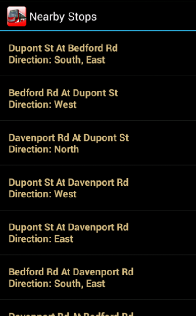 Additionally, this application provides access to the scheduled arrival times for selected stops. Users can retrieve the scheduled arrival time by selecting route number, direction and stop name and can store it for later use. This can be useful when user does not have internet connectivity and would like to see the scheduled arrival times.
