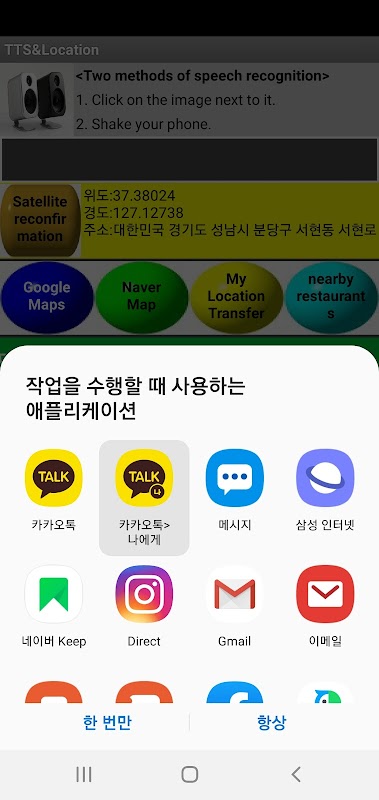 Also, another function is to check your location and display it on Google Maps or Naver Maps. You can share your location with others. It also shows restaurants around you.
