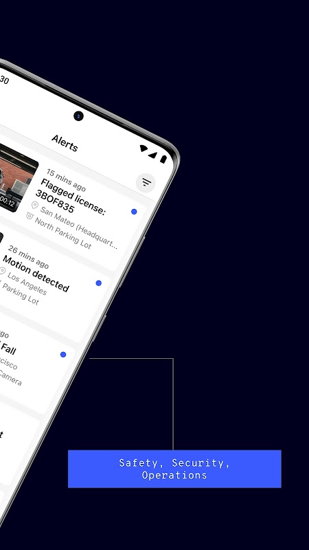 Alimentée par une variété d'algorithmes de niveau entreprise, l'application mobile Turing Vision vous permet à la fois de visualiser les flux de vos caméras, mais également de rechercher et de répondre aux alertes de sécurité et de sécurité dans tous vos emplacements.