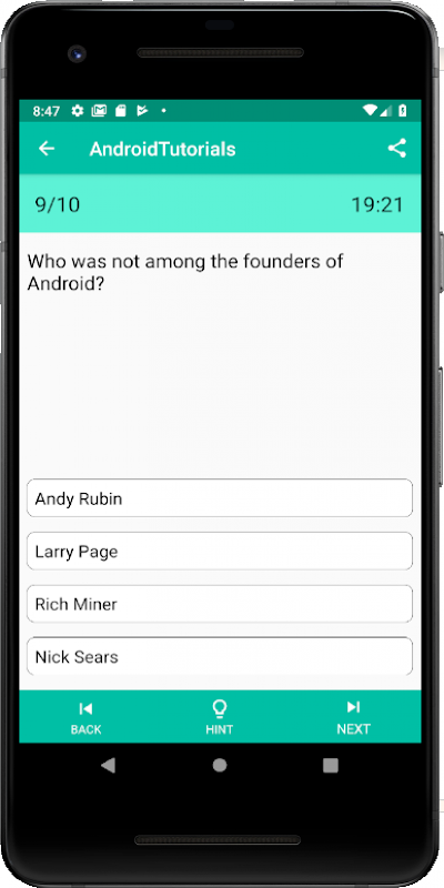 Ce quiz pour Android comprend au total 10 questions à choix multiples auxquelles il faut répondre dans un délai de 20 minutes.Pour chaque bonne réponse de ce quiz android, le score est augmenté d'un point et le même est mis à jour dans la barre d'évaluation. De plus, ce quiz android est fourni avec un indice qui pourrait être utilisé au fur et à mesure des besoins. Il existe une fonctionnalité supplémentaire consistant à partager les questions Android avec votre ami.