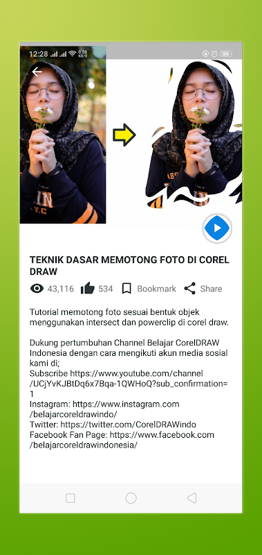 Aplikasi Tutorial Video CorelDRAW sangat cocok bagi Anda para pekerja dan pelajar/mahasiswa yang sering disibukkan dengan tugas membuat desain. Dalam aplikasi ini, Anda akan diajarkan cara mudah membuat desain poster, banner, brosur, dan sebagainya menggunakan CorelDRAW. Aplikasi Tutorial Video CorelDRAW ini merupakan aplikasi yang berisi materi tutorial CorelDRAW menggunakan Bahasa Indonesia.