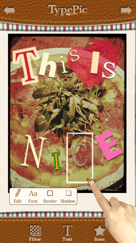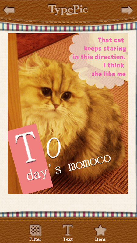 Vous pouvez habiller l'image dans l'album ou prises avec l'appareil photo dans un style facilement en utilisant les plus de 10 types de filtres élégantes! Lorsque vous avez sélectionné la police de votre choix à partir d'une variété de polices, vous pouvez mettre caractère traitement d'une photo! Vous pouvez augmenter pour télécharger des polices supplémentaires. Vous êtes en mesure d'organiser le caractère pour correspondre au goût de la transparence de l'image, la couleur du texte, épaisseur couleur de la ligne de frontière, le type et la couleur de l'ombre. Vous pouvez utiliser une variété de formes comme une étoile, coeur ou un cercle ou un ballon de mettre une partie du caractère. Le fonctionnement est simple et très intuitive. Vous pouvez l'éditer facile à toucher directement la partie d'édition!