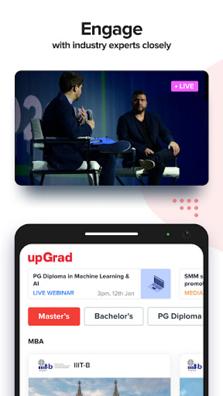 Du MBA, M.Sc. ou autres diplômes PG au baccalauréat, l'application upGrad Learning a tout pour plaire ! Explorez des programmes dans les domaines de la gestion, de la science des données, de l'apprentissage automatique, du génie logiciel, du marketing numérique, du référencement, de la blockchain, de l'analyse, de la gestion de produits, du Big Data, etc. Interagissez avec des professionnels, maîtrisez les compétitions Kaggle, réseautez avec des professionnels partageant les mêmes idées, le tout dans une seule application !