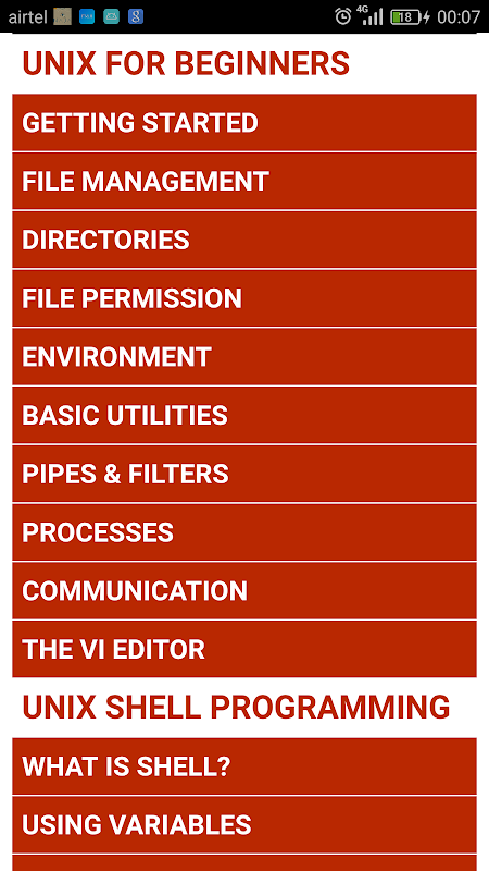 This app also includes the basic as well advanced fundamentals of shell programming.