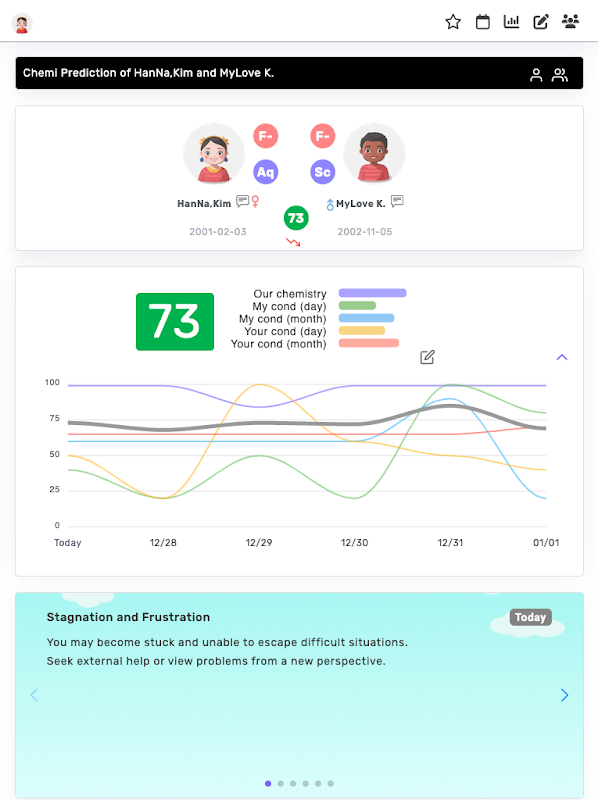 Fournit la compatibilité (chimie) entre deux personnes dans des informations textuelles et visuelles.