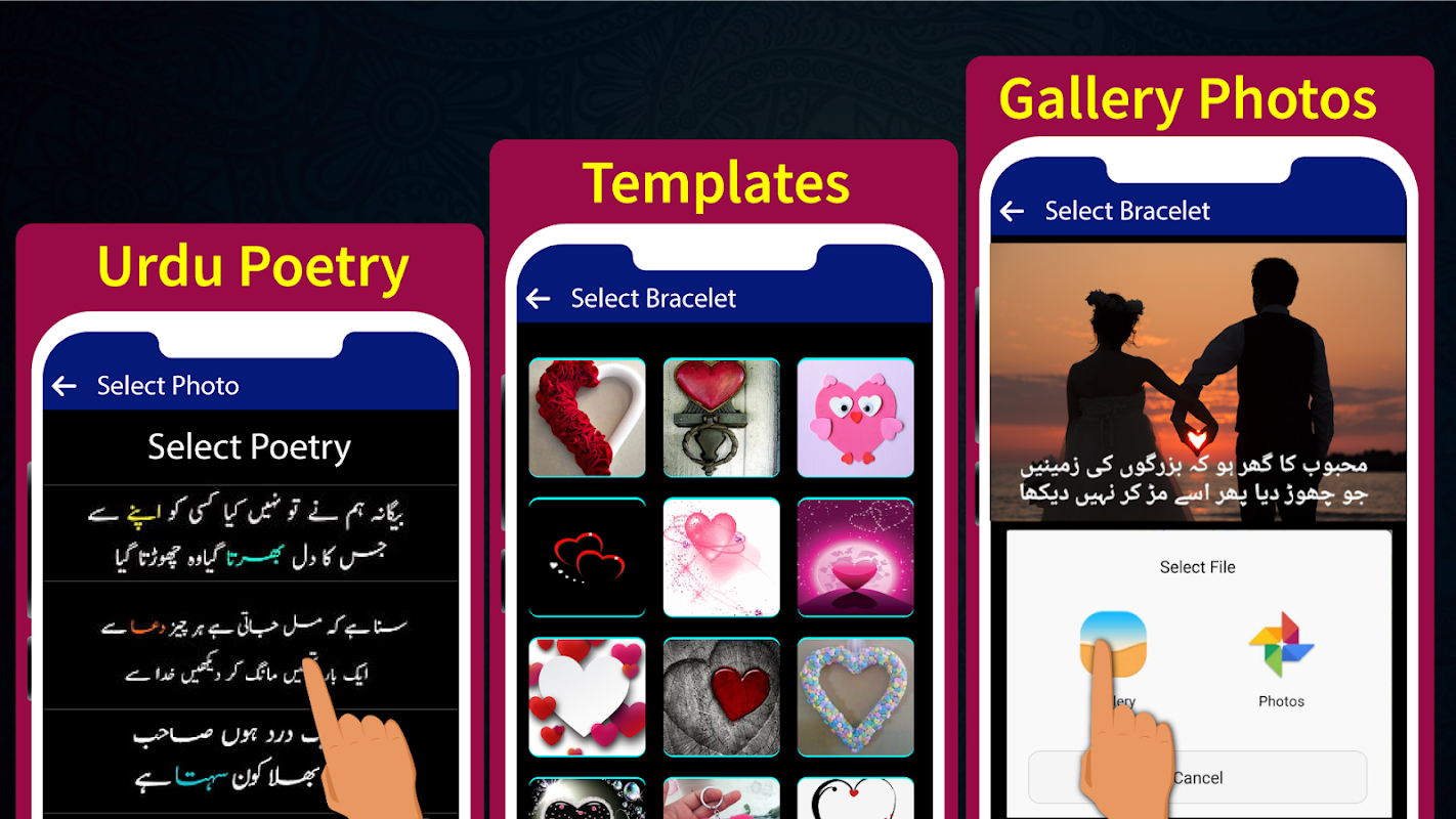 Créateur de messages en ourdou élégant : Photext Master est une application qui aide l'utilisateur à écrire du texte en ourdou sur des photos, ainsi que des messages de poésie en ourdou, comme un créateur de poésie en ourdou avec différentes polices et styles, et se moque de leur travail et utilise également différentes langues comme l'anglais et l'ourdou sur la photo. Si vous voulez écrire votre nom ou le nom de votre bébé filles / garçons dans un style fantaisiste et génial, l'application Write Urdu on Photo est parfaite pour vous. Vous pouvez souhaiter à vos amis et aux membres de votre famille leur anniversaire, anniversaire, messages d'amour et photos de moments amusants en utilisant Write Urdu on Photo Master. Écrire du texte en ourdou sur l'application photo a la possibilité d'écrire des photos à double nom avec l'éditeur de texte élégant en ourdou. L'utilisateur peut utiliser l'application d'édition de photos "Stylish urdu post maker: Photext Master" pour écrire en ourdou sur une photo et créer une affiche en ourdou qui n'a pas été possible sans l'aide d'un outil de création de post urdu.