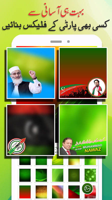 De beaux arrière-plans avec des autocollants Pmln, des autocollants Pti, des autocollants Ppp, des autocollants Tlp, des autocollants Jamaat-e-Islami, des badges et également l'importation de flex depuis votre galerie de téléphone.