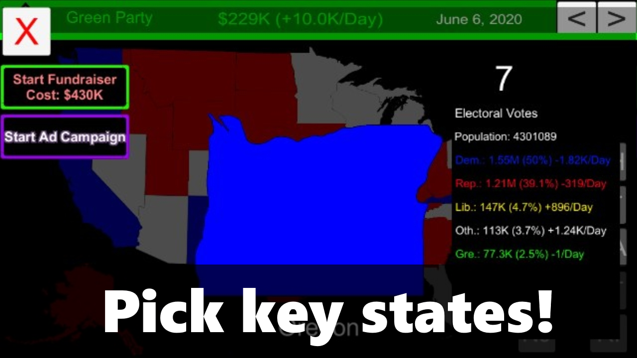 L'Amérique, terre d'opportunités et patrie des braves, est une superpuissance mondiale depuis plus d'un siècle. Pour cette raison, le poste le plus prestigieux de la planète est celui de président des États-Unis d'Amérique. Cependant, avant de devenir le leader du monde libre, le président doit d'abord faire preuve d'un type particulier de ruse et de détermination lors de la campagne électorale. Dans United States Election Simulator, vous pouvez utiliser votre tact politique et rivaliser avec plusieurs partis politiques pour le contrôle de la Maison Blanche. Planifiez une stratégie gagnante, faites attention à votre budget et investissez dans les bons états au bon moment !