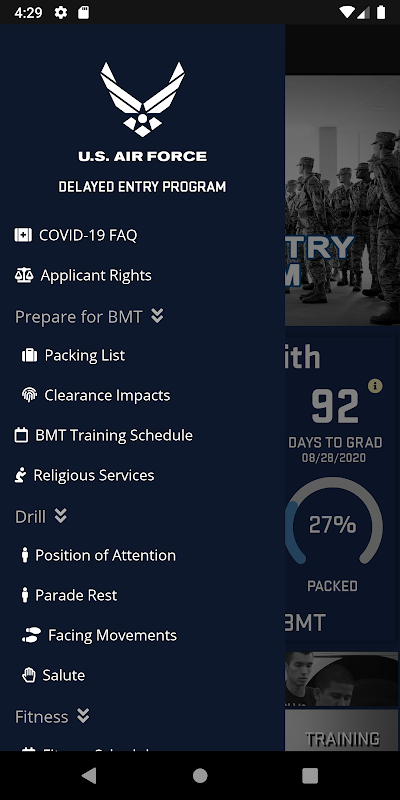 L'application USAF Delayed Entry Program (DEP) fournit aux recrues de l'Air Force un accès mobile aux informations essentielles. L'application permet de s'améliorer et de se préparer avant d'entrer dans les environnements stricts de la formation militaire de base (BMT) et de l'école de formation des officiers (OTS). Les utilisateurs peuvent accéder aux relevés de rapport, aux mouvements des exercices, aux calendriers d'entraînement et aux informations sur la condition physique et la nutrition. L'application DEP de l'USAF comprend également une calculatrice de conditionnement physique, des listes de contrôle interactives d'emballage et de préparation financière, des quiz et des cartes flash pour aider à préparer les membres du DEP à la formation de base des militaires et des officiers.