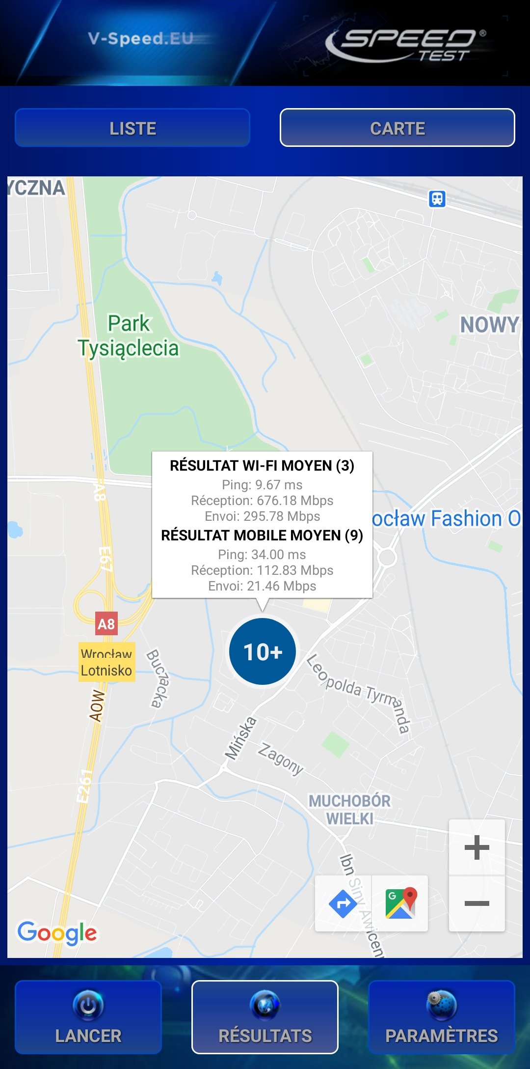 • présentation d’informations détaillées sur les tests (valeurs download/upload/ping mesurées, type de connexion, date, paramètres des tests),