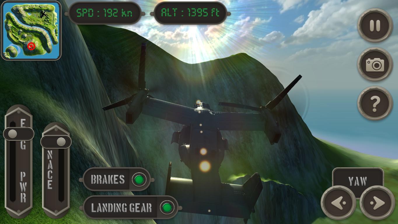This Flight Simulator by TeaPOT Games, is extremely physics accurate, and offers the primary flight controls and functions of the osprey such as Engine power, Nacelle tilt, roll, pitch, yaw, landing gear, and brakes. It doesn't emulate the secondary and tertiary flight controls, given the input limitations of mobile devices.