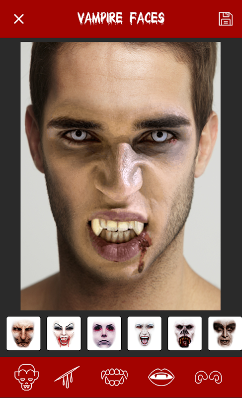 En utilisant cet éditeur de photos de Vampire Camera, vous pouvez appliquer des dents de vamp virtuel pendant quelques secondes!