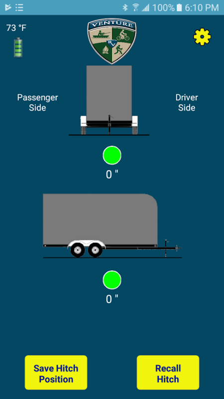 Venture RV peut également être utilisé pour enregistrer la hauteur avant requise pour dégager l'attelage lors de la déconnexion d'un véhicule de remorquage. Désengagez simplement l'attelage, soulevez la remorque jusqu'à un point dégageant l'attelage et cliquez sur le bouton Enregistrer la position d'attelage. Lorsque vous êtes prêt à vous reconnecter, démarrez l'application Venture RV et cliquez sur le bouton Recall Hitch Position. Relevez ou abaissez la prise avant jusqu'à ce que l'écran affiche 0 distance et que l'indicateur devienne vert. Votre remorque est maintenant prête à être connectée à votre véhicule tracteur.