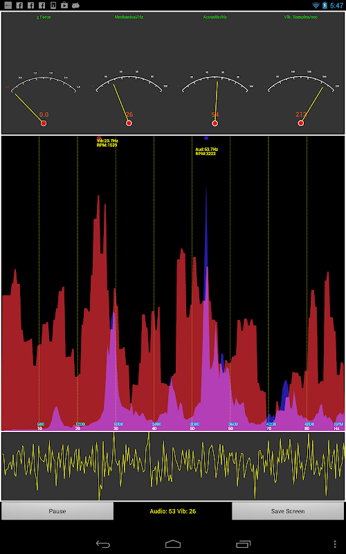 Vibrations utilise les flux de données provenant de l'accéléromètre intégré et microphone: il calcule deux FFT simultanées, l'une des mesures mécaniques, l'une des mesures sonores. Il montre ensuite les spectres de fréquence sur l'écran. L'axe de la fréquence est marqué en Hz et RPM (tours par minute).