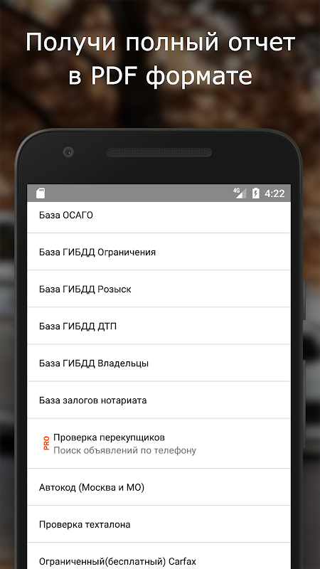 La première et la seule application qui prend en charge toutes les bases de données pour les contrôles. Accident, base de la police de la circulation, les banques et les huissiers de dépôt, TO, informations et surenchérir sur les rapports CarFax, le vol, la vérification sur la base du propriétaire FSSP registre Taxi.