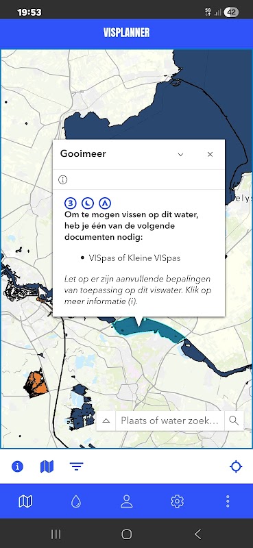 En vous connectant avec votre compte MySportvisserij, vos documents de pêche actifs sont récupérés et les eaux où vous êtes autorisé à pêcher sont colorées en bleu (voir légende pour plus d'informations).