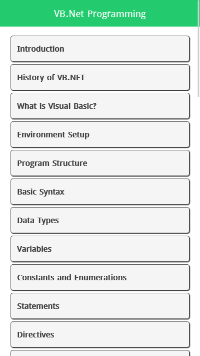 Basic Visual Basic .NET Programming App is essential for programmers. It will be helpful for software developing and app developing. This Learn Visual Basic .NET Programming tutorial app will provide you example with explanation. So now you can carry your Visual Basic .NET Programming Course offline anywhere by this app and can learn anytime.
