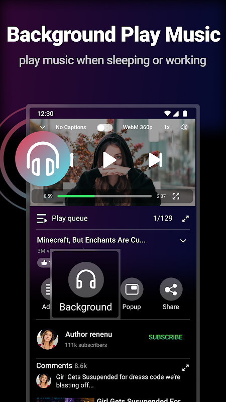 - When you are working or sleeping, use background play mode to enjoy tube videos or music. You don’t need to worry about the sudden pop-up of advertisements or other messages causing the playback to be interrupted.