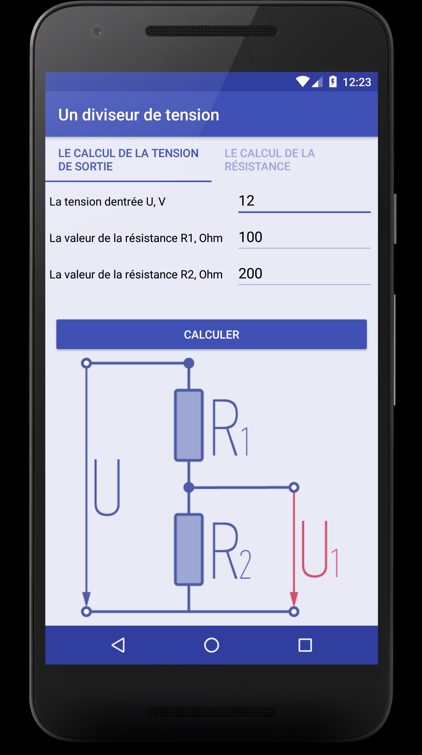 - calcul de la tension de sortie, selon les valeurs de tension d'entrée et de résistance spécifiées;
