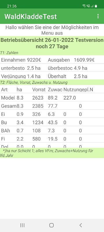 Environ un quart de la forêt allemande appartient à des propriétaires forestiers privés qui disposent de moins de 20 hectares de forêt. Le Waldkladde a été développé pour ce groupe comme un outil simple et peu coûteux pour promouvoir l'intérêt pour la forêt et la gestion durable. Dans le dépôt dynamique, les données d'inventaire ou d'aménagement forestier sont mises à jour à l'instant courant en tenant compte de la croissance et des mesures prises. Cela permet aux propriétaires forestiers d'avoir une vue d'ensemble à jour de leurs opérations. De plus, vous serez informé des mesures sylvicoles nécessaires et des interventions d'éclaircie avec des suggestions pour les quantités d'enlèvement.