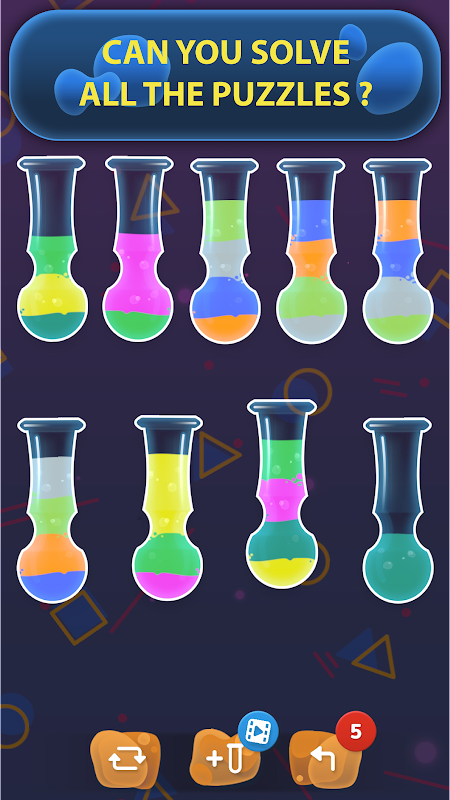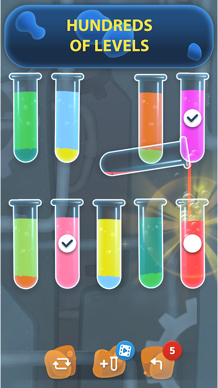 Au fur et à mesure que vous maîtriserez le jeu, le nombre de tubes augmentera et cela deviendra plus difficile à résoudre. Essayez de ne pas rester coincé, mais ne vous inquiétez pas, vous pouvez toujours recommencer le niveau à tout moment ou ajouter un tube supplémentaire pour vous aider.