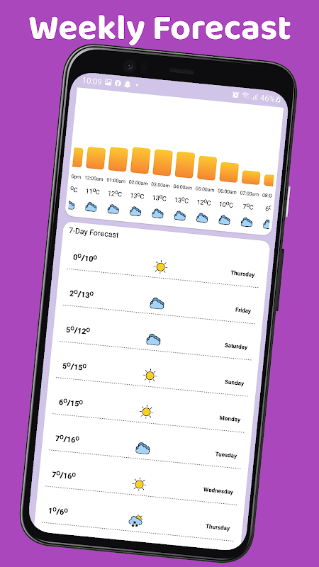 Obtenez des prévisions météorologiques détaillées, y compris les conditions météorologiques, les températures maximales et minimales, les précipitations et le vent. Vous pouvez consulter toutes ces données tous les jours ou même toutes les heures quand vous le souhaitez.