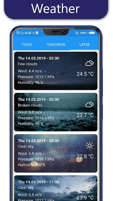 - Change unit setting: Temperature (C/F), Time format (12h/24h), Precipitation (mm, inch), wind speed (km/h, mi/h, m/s), pressure (mmhg, hPa, mbar)