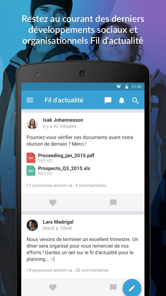 Partagez de nouvelles connaissances, des idées et des réalisations internes de manière facile et avec le reste de votre équipe, département ou organisation. Enrichissez vos messages avec des photos, vidéos et émoticônes. Gardez l’aperçu des nouveaux messages de vos collègues, de l’ organisation et vos partenaires externes.