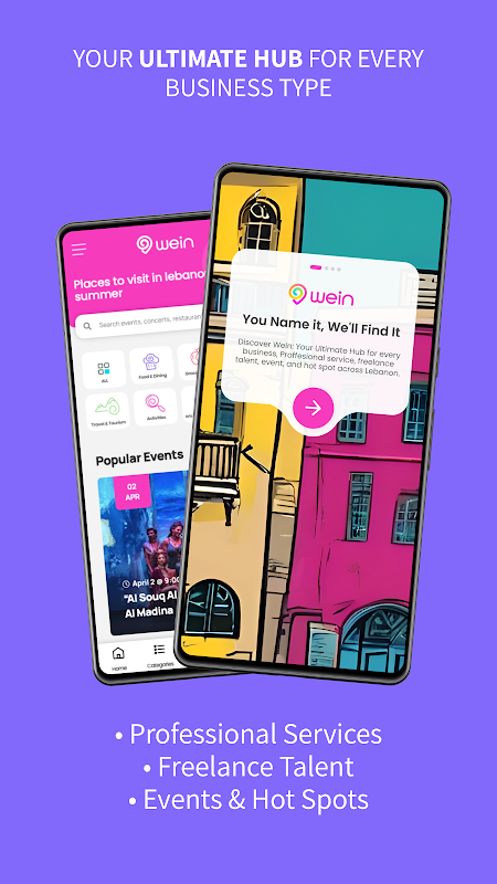 Wein est une application mobile innovante tout-en-un prête à redéfinir la visibilité et la portée client au Liban. En tant que guide et annuaire complet, il connecte les utilisateurs à une large gamme de services et d'événements, des restaurants et pharmacies aux écoles, en passant par les indépendants et les particuliers proposant divers services.