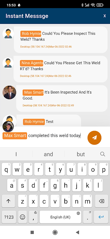 Les inspecteurs en soudage peuvent enregistrer les résultats d'inspection visuelle des soudures et prendre des photos des soudures dans l'application mobile.