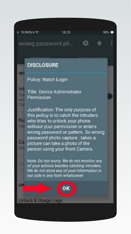 This app uses the Device Administrator permission. We need this to detect failed unlock attempts. To uninstall this app, touch Uninstall from the menu. If that doesn't work go to Android Settings, Security, Device Admins, and deactivate IntruderSelfie before uninstalling.