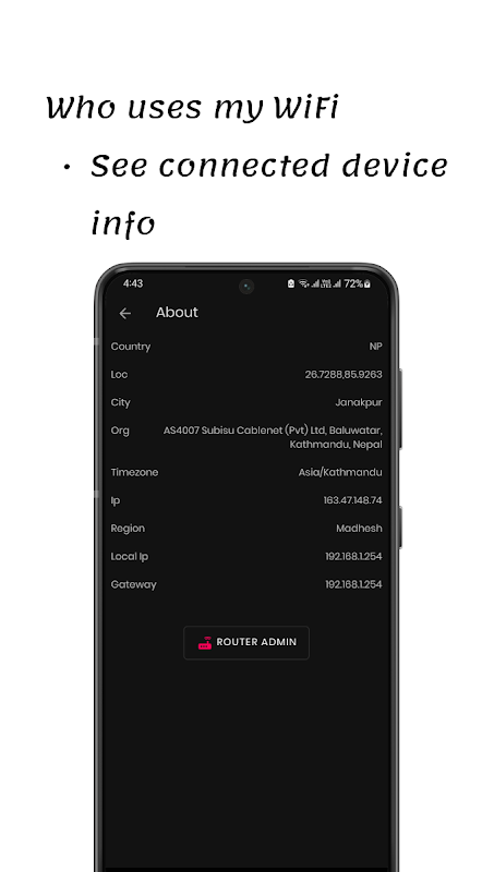 - Recherchez les détails de l'appareil et des informations telles que le pays, l'emplacement, la ville, l'organisation, l'adresse IP et l'adresse de la passerelle.