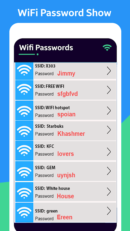 Wifi Password Show est un visualiseur de mot de passe WiFi simple et gratuit. Récupération de mot de passe WiFi, lecteur de mot de passe WiFi, recherche de clé WiFi, application d'affichage de mot de passe WiFi. Application de récupération de mot de passe wifi qui vous aide à voir les mots de passe des réseaux wifi que vous avez déjà connectés.