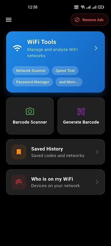 QR, codes-barres, outils Wi-Fi et affichage des appareils connectés. Numérisez, générez, enregistrez