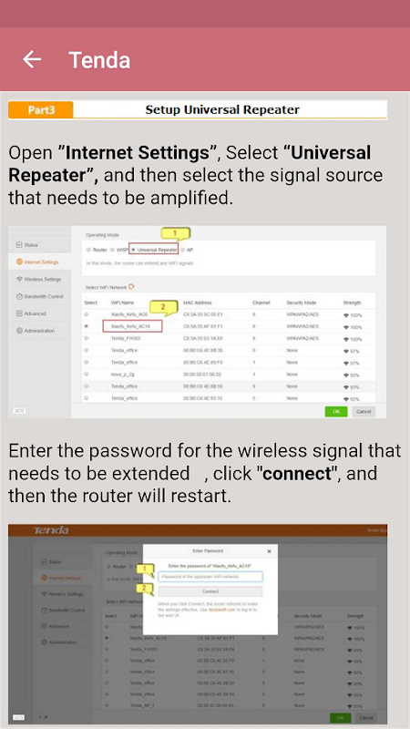 Dans notre application mobile, il est expliqué comment configurer le répéteur wifi . S'il y a des points dans votre maison où les signaux sans fil ne peuvent pas atteindre, ou si vous souhaitez utiliser votre connexion Internet sans fil dans une zone plus large de votre lieu de travail, le répéteur wifi est fait pour vous. La configuration et les paramètres de configuration peuvent différer pour chaque marque et modèle. Vous pouvez effectuer les réglages nécessaires avec wifi repeater app for android. Nous avons expliqué les configurations des marques les plus utilisées dans notre application mobile. Le wifi repeater/router/ap reçoit le signal du routeur et le répète exactement. S'il ne reçoit pas suffisamment de signal, la connexion Internet peut être interrompue. Par conséquent, le positionnement de l'appareil est important.