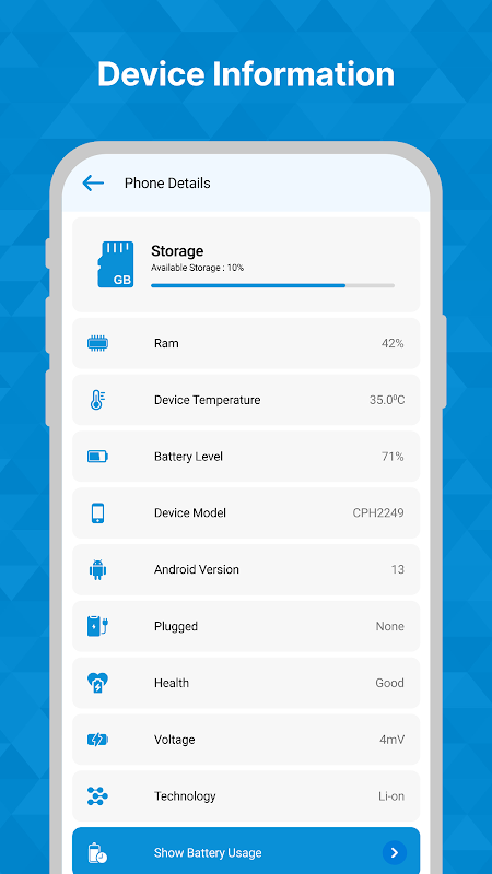 Obtenez tous les détails sur votre appareil, comme les informations de stockage, la RAM totale, la température de l'appareil, le niveau de la batterie, le modèle de l'appareil, la version Android, la prise, l'état de santé, la tension, la technologie et bien d'autres. Vous pouvez également trouver des détails sur l'utilisation de la batterie de votre appareil, par exemple lorsque la batterie de votre appareil est plus consommée au cours d'une journée, dans une vue graphique. Profitez donc de l'utilisation de la batterie de votre appareil et d'autres détails en utilisant notre application intelligente.