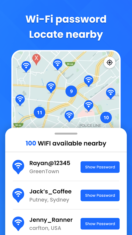 WiFi Unlocker : WiFi Password est une application puissante qui vous aide à découvrir et à déverrouiller facilement les réseaux Wi-Fi à proximité. L'application WiFi Map Password vous permet de localiser les connexions WiFi à proximité sur une carte et d'accéder à leurs détails sans effort. Plus besoin de vous connecter aux réseaux autour de votre région : utilisez simplement cette application WiFi Map Password pour explorer les réseaux disponibles sur la carte et obtenir facilement des détails. Il comprend également une fonctionnalité Générateur de mots de passe qui vous permet de créer des mots de passe forts et sécurisés en utilisant votre choix de majuscules, minuscules, symboles, chiffres et caractères. WiFi Network Finder pour trouver facilement la liste de tous les réseaux wifi disponibles dans votre région.