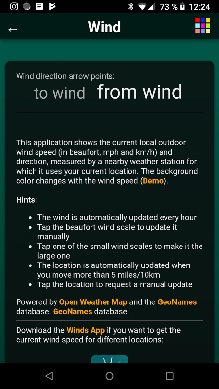 Voulez-vous faire de la voile, de la planche à voile, du vélo, du kting-up, du drone ou juste à la porte? Cette application indique la vitesse actuelle du vent extérieur local (en beaufort, mph, km / h, m / s et nœuds) et la direction, mesurée par une station météorologique à proximité pour laquelle il utilise votre position actuelle.