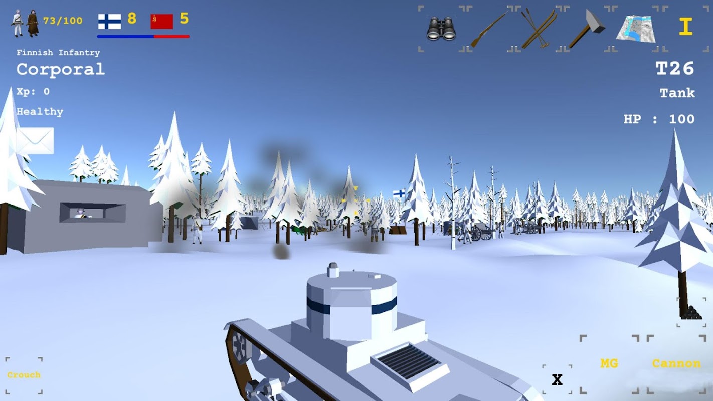 Chars T26 et T28, chars lance-flammes, voitures blindées, motoneiges aerosani, camions, traîneaux tirés par des rennes. Skiez à travers les vastes forêts et lacs de Finlande pour déborder l'ennemi.