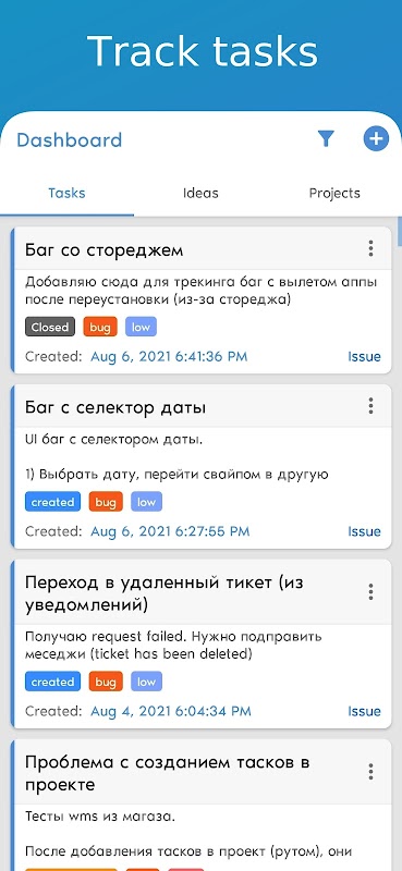 In the application, you can work with tasks, projects, vectors. Also receive notifications.