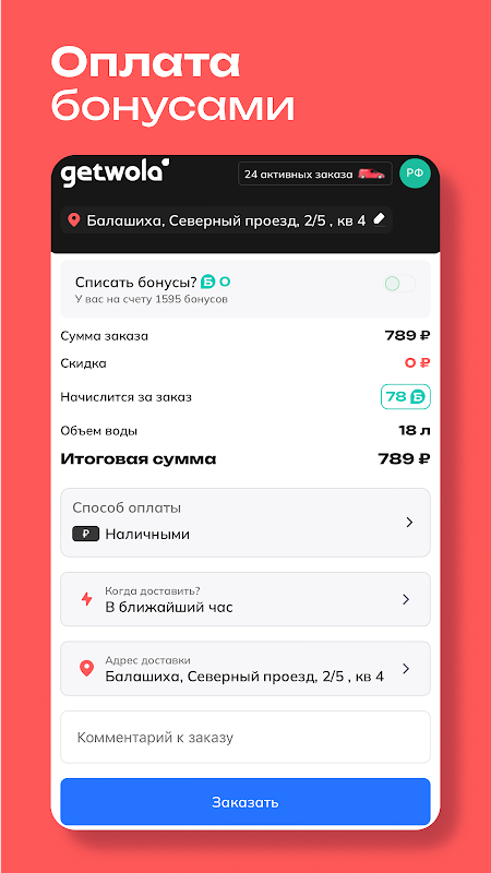 Getwola est un moyen simple et fiable d'obtenir de l'eau en bouteille de 18,9 litres de haute qualité, livrée dans tout Moscou en quelques minutes. Contrairement à d’autres services, nous ne prenons pas de caution pour l’emballage et ne payons pas les retards.