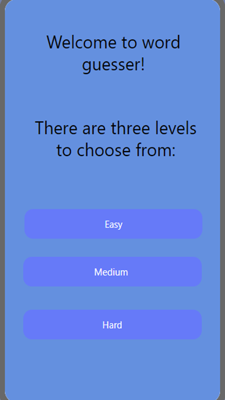 L'application s'appelle Word Guesser. Vous avez le choix entre trois niveaux différents : facile, moyen et difficile. Les problèmes contiennent des mots confus. Pour répondre à ces problèmes, vous devez comprendre quel est le mot.